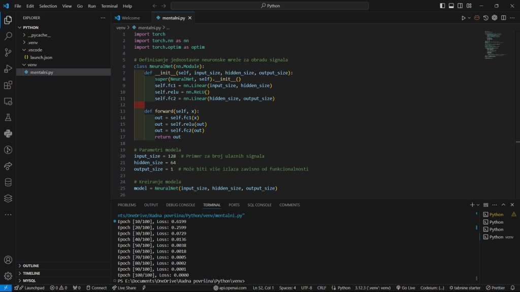 - Analiza signala u realnom vremenu: Obrada moždanih signala mora biti brza i efikasna kako bi se omogućila stimulacija u realnom vremenu. Algoritmi koriste napredne metode za prepoznavanje obrazaca i klasifikaciju signala, omogućavajući preciznu i efikasnu stimulaciju mozga. Jedna od tehnika koja se koristi je neuronska mreža, koja je obučena da prepozna specifične šablone moždane aktivnosti i da generiše odgovarajuće stimulacione signale.