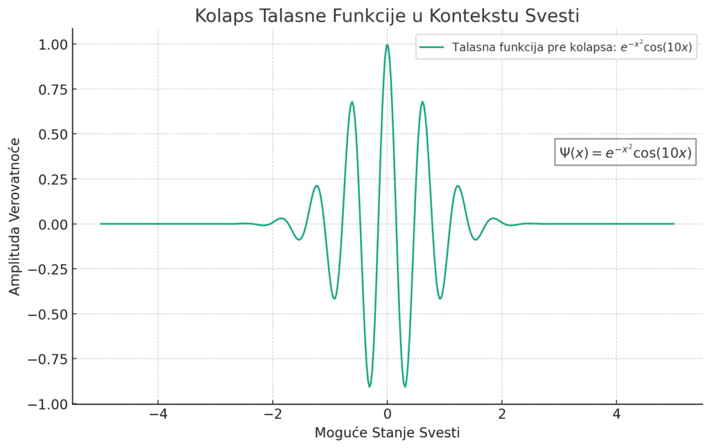 Ova formula predstavlja talasnu funkciju pre njenog kolapsa i ilustruje kako potencijalna stanja svesti nisu uniformno raspoređena, već imaju tendenciju da se grupišu oko nekih “preferiranih” stanja (centri oscilacija), s varijacijama u verovatnoći pojavljivanja koja osciluju kao talasi duž spektra mogućnosti.